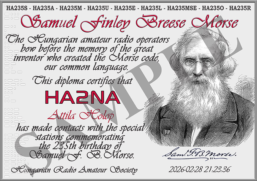 The name of SAMUEL MORSE shall be put together from the contacts made with the callsigns representing each letter. Since some letters occur twice in the name, there will also be a joker station with a callsign of HA235MSE, which can be used to replace the callsigns containing the second M, S, and E. It is enough to work with this station once as well.